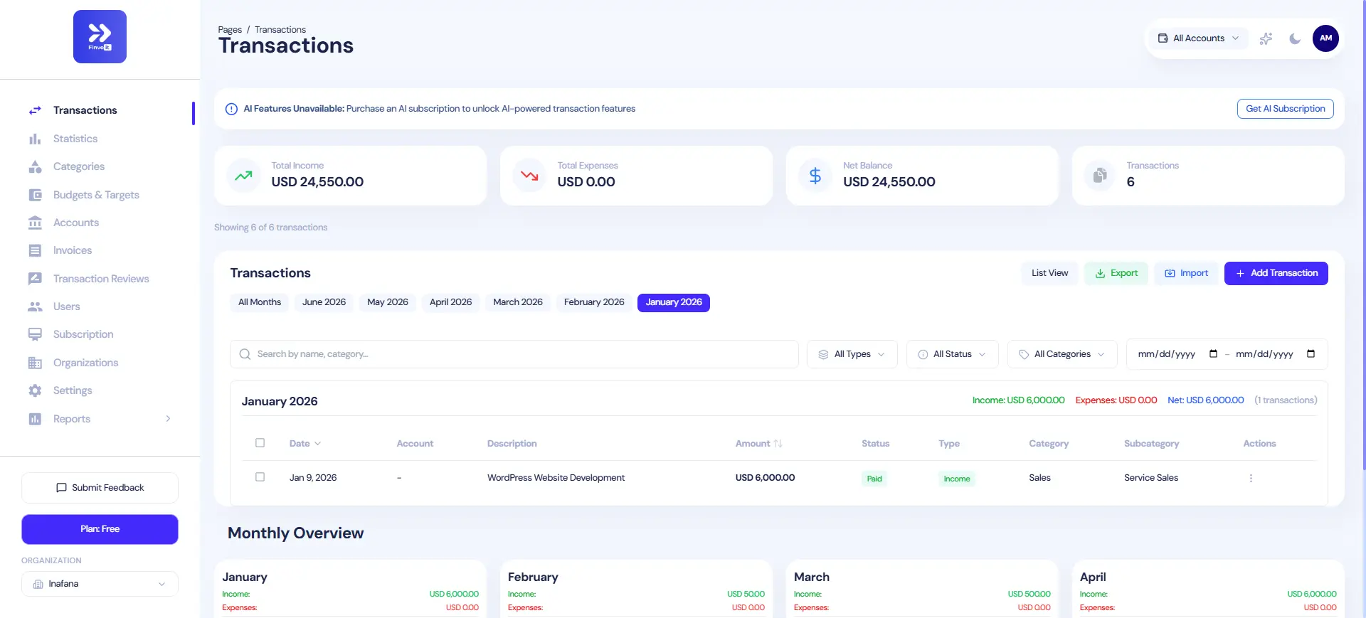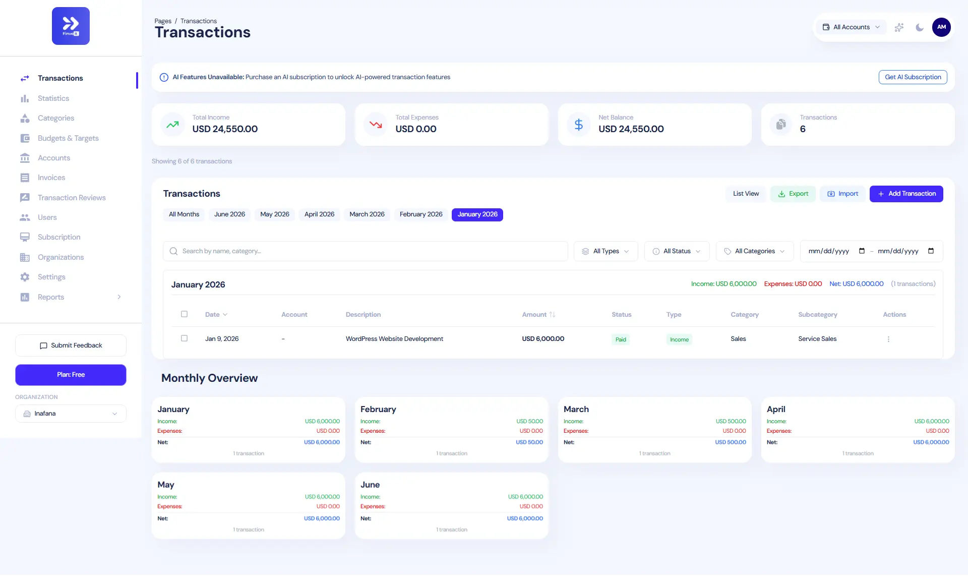 Keep your finances fully organized by creating your own income and expense categories. Tailor everything to match your workflow so reports stay accurate and management becomes effortless.